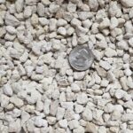 About 1” in size and smaller, sparkly white with gray tones, chip-shaped stone. The brightest stone we carry brightness makes it stand out. Most commonly used in landscape beds. Excellent for houses with white trim or brightening up dark landscaping.