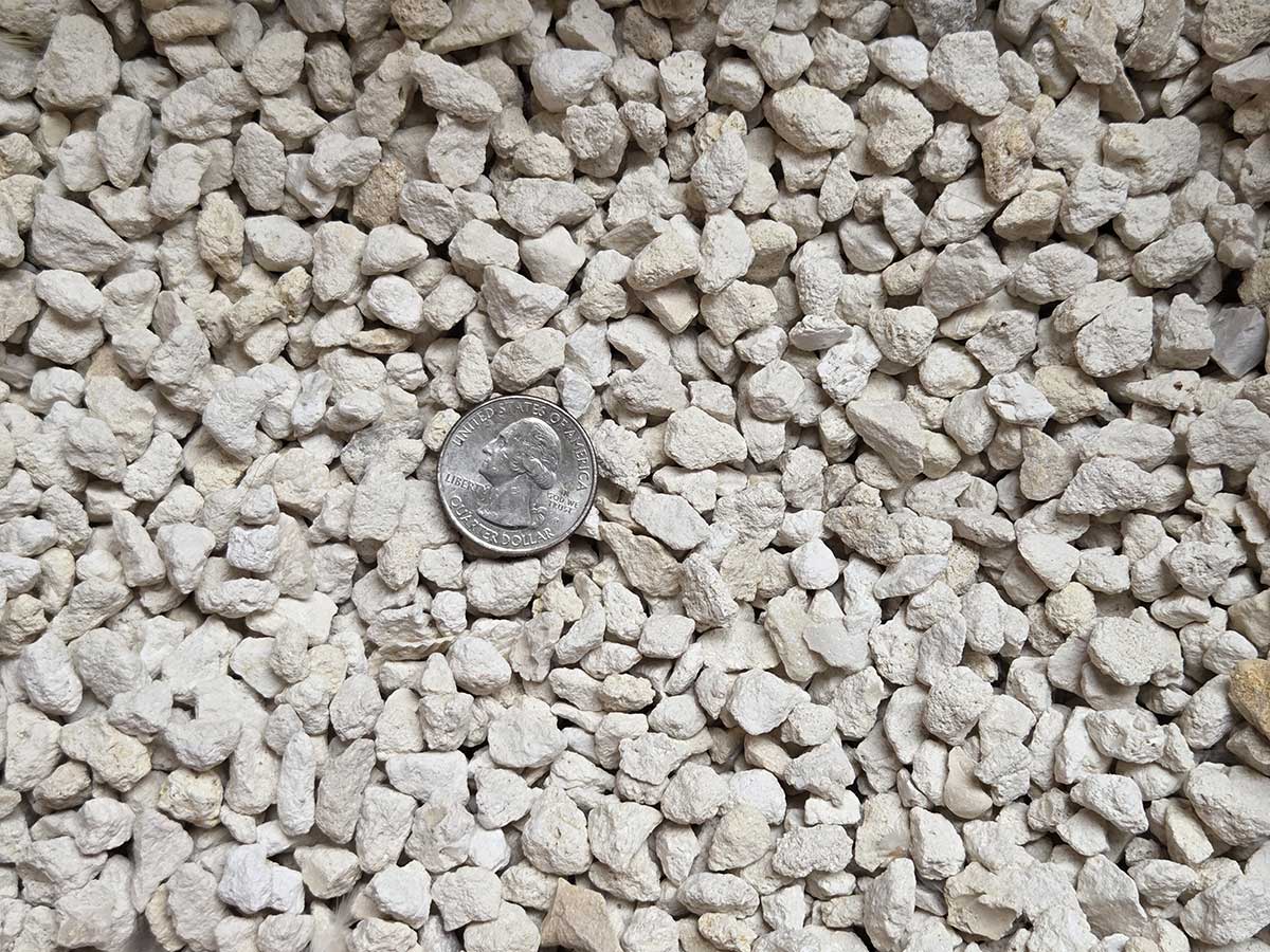 Small yellowish-white round stone about the size of a chickpea or smaller. This Florida native material is a cost-effective and popular choice for drainage, driveways, & parking lots. Please keep in mind: this product gets dusty.