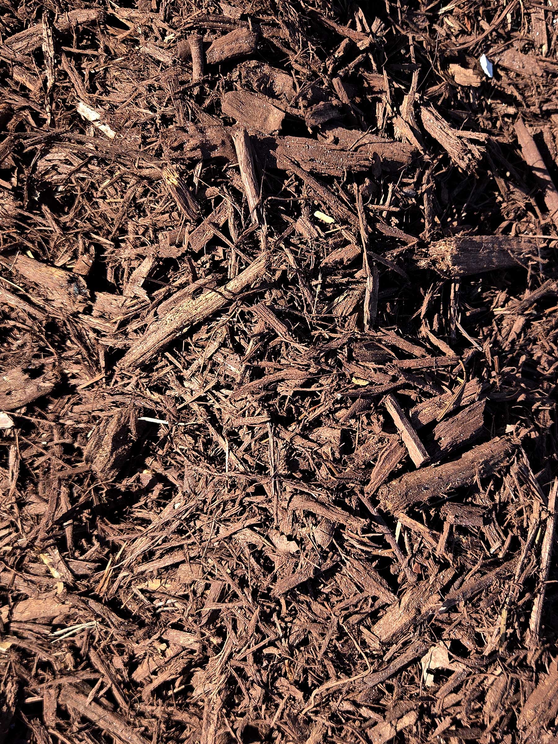 Dyed brown mulch, small brown shreds of hardwoods. Very economical, easy to transport & install. Sold by the yard.