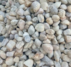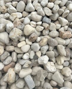 2″ white/tan river rock, most commonly used in landscape beds. The stones come in a range of very light to some brown shades.